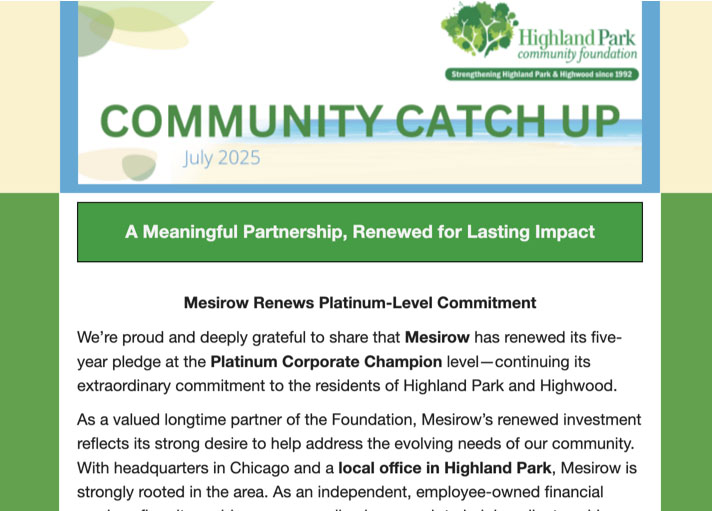 We’re proud and deeply grateful to share that Mesirow has renewed its five-year pledge at the Platinum Corporate Champion level—continuing its extraordinary commitment to the residents of Highland Park and Highwood.