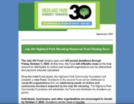 Once the initial Fund closes, the Highland Park Community Foundation will establish a new Fund. Donations to the second Fund will be distributed to nonprofit organizations that are addressing needs of victims and community members impacted by the July 4th shooting. The Highland Park Community Foundation will administer the Fund and distribute the donations as grants.